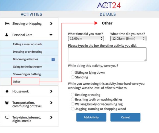 The main activity survey (called the ACT24) will ask you to report what activities you did over the previous day. This is the other survey you will be asked to complete a few times over the year (in addition to the diet one described above). It will ask you to choose activities that reflect what you did for all hours of your day, such as sleeping, getting ready in the morning, getting to work, and so on. It will ask you some additional questions depending on the activity, such as how much of the activity was spent sitting vs. standing, and the level of exertion (e.g., for activities like sports).