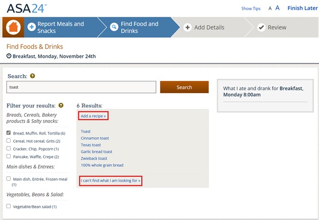 The main diet survey (called the ASA24) will ask you to report what you ate and drank over the previous day. This is the survey you will be asked to complete a few times over the year. It will ask you to report all foods and drinks for your meals and snacks, as well as any supplements (e.g., vitamins), as well as what time you ate/drank, where you consumed them (e.g., home, restaurant), and a few other questions. The survey may also ask you a few extra questions to help prompt reporting of things people sometimes forget, like adding toppings to sandwiches and salads.