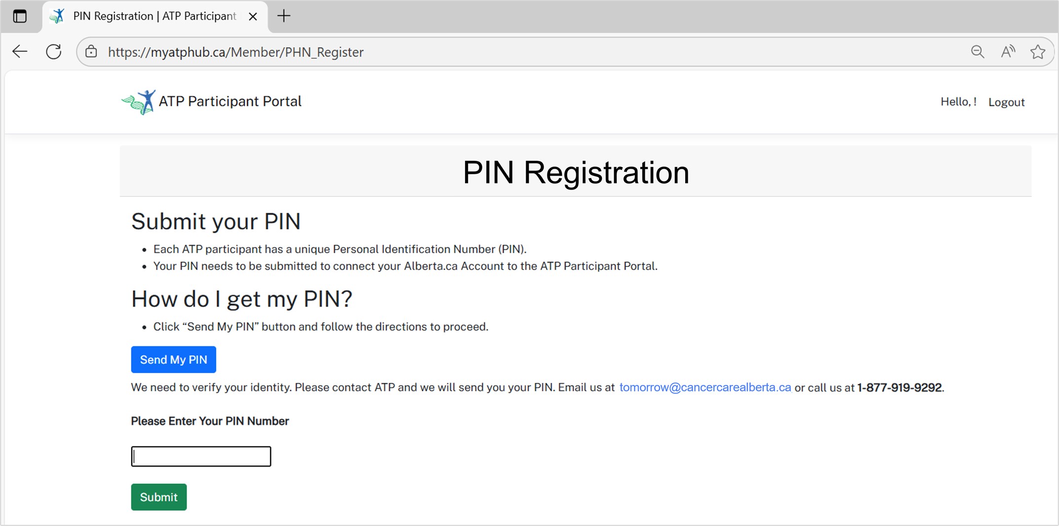 If you have reached the “Submit Your PIN” webpage (see picture below), your Alberta.ca Account is not connected to the ATP Participant Portal.